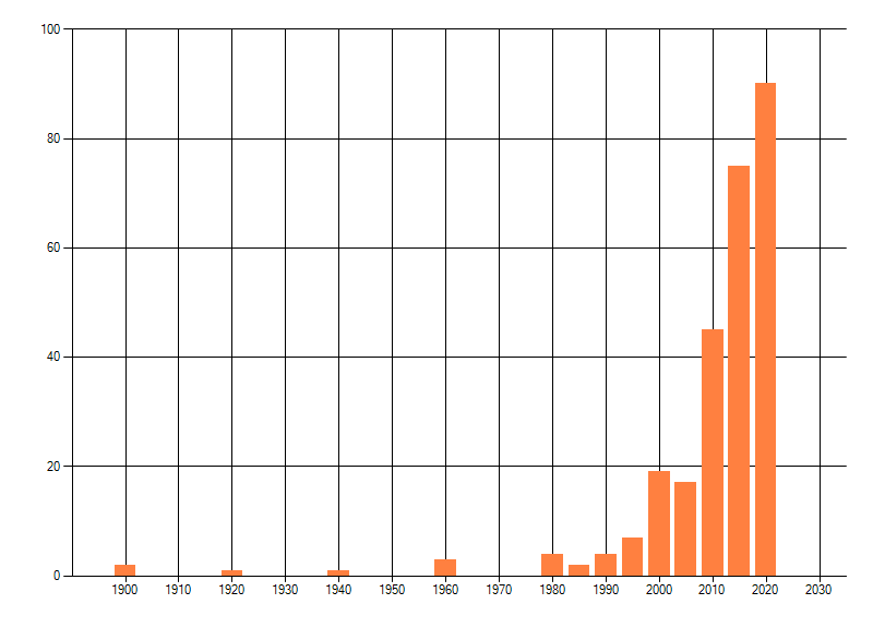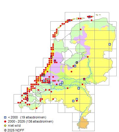 Het aantal atlasblokken (5x5 km) waarin de soort is gemeld binnen een periode van vijf jaar (vanaf 1980) of twintig jaar. Niet gecorrigeerd voor waarnemersinspanning en het aantal doorgegeven waarnemingen kan sterk variëren per periode, dus een trend in verspreiding kan hier niet direct uit worden afgelezen. Het opgegeven jaartal is het eerste jaar van de periode. Bron: gevalideerde waarnemingen uit de NDFF.