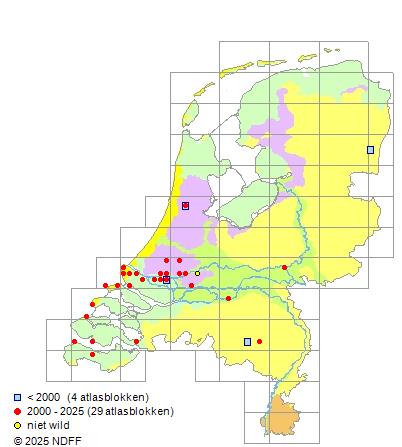 Het aantal atlasblokken (5x5 km) waarin de soort is gemeld binnen een periode van vijf jaar (vanaf 1980) of twintig jaar. Niet gecorrigeerd voor waarnemersinspanning en het aantal doorgegeven waarnemingen kan sterk variëren per periode, dus een trend in verspreiding kan hier niet direct uit worden afgelezen. Het opgegeven jaartal is het eerste jaar van de periode. Bron: gevalideerde waarnemingen uit de NDFF.