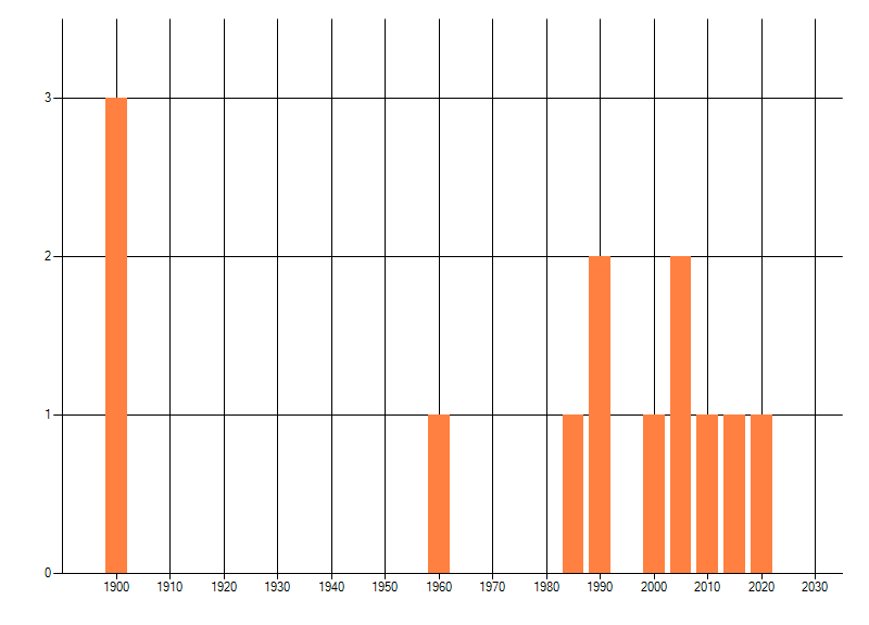 Het aantal atlasblokken (5x5 km) waarin de soort is gemeld binnen een periode van vijf jaar (vanaf 1980) of twintig jaar. Niet gecorrigeerd voor waarnemersinspanning en het aantal doorgegeven waarnemingen kan sterk variëren per periode, dus een trend in verspreiding kan hier niet direct uit worden afgelezen. Het opgegeven jaartal is het eerste jaar van de periode. Bron: gevalideerde waarnemingen uit de NDFF.