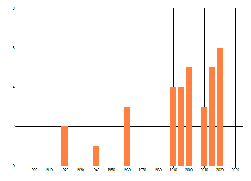 Het aantal atlasblokken (5x5 km) waarin de soort is gemeld binnen een periode van vijf jaar (vanaf 1980) of twintig jaar. Niet gecorrigeerd voor waarnemersinspanning en het aantal doorgegeven waarnemingen kan sterk variëren per periode, dus een trend in verspreiding kan hier niet direct uit worden afgelezen. Het opgegeven jaartal is het eerste jaar van de periode. Bron: gevalideerde waarnemingen uit de NDFF.