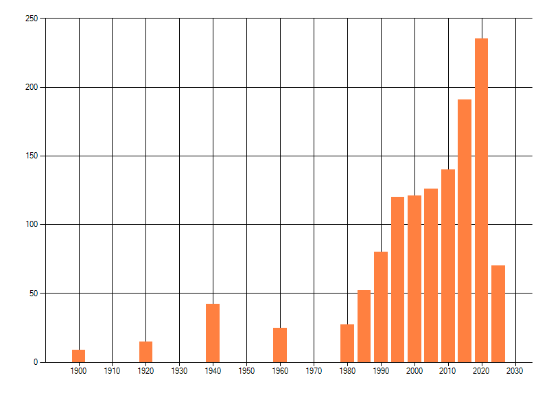 Het aantal atlasblokken (5x5 km) waarin de soort is gemeld binnen een periode van vijf jaar (vanaf 1980) of twintig jaar. Niet gecorrigeerd voor waarnemersinspanning en het aantal doorgegeven waarnemingen kan sterk variëren per periode, dus een trend in verspreiding kan hier niet direct uit worden afgelezen. Het opgegeven jaartal is het eerste jaar van de periode. Bron: gevalideerde waarnemingen uit de NDFF.