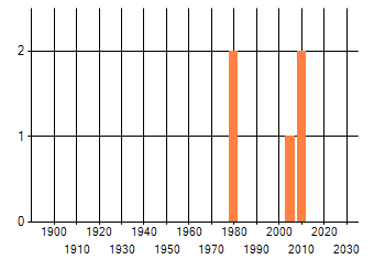 Het aantal atlasblokken (5x5 km) waarin de soort is gemeld binnen een periode van vijf jaar (vanaf 1980) of twintig jaar. Niet gecorrigeerd voor waarnemersinspanning en het aantal doorgegeven waarnemingen kan sterk variëren per periode, dus een trend in verspreiding kan hier niet direct uit worden afgelezen. Het opgegeven jaartal is het eerste jaar van de periode. Bron: gevalideerde waarnemingen uit de NDFF.