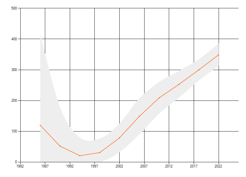 Gemiddelde trend van het aantal kilometerhokken waarin de soort voorkomt, weergegeven als indexcijfer (1975-1978 = 100). De trend is gecorrigeerd voor waarnemersinspanning en geeft de relatieve verandering in het aantal bezette kilometerhokken weer. Voor de berekening worden de data per periode van vier jaar samengenomen. In de grafiek correspondeert ieder punt met het laatste jaar van zo'n periode.