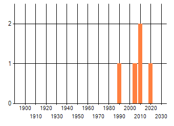 Het aantal atlasblokken (5x5 km) waarin de soort is gemeld binnen een periode van vijf jaar (vanaf 1980) of twintig jaar. Niet gecorrigeerd voor waarnemersinspanning en het aantal doorgegeven waarnemingen kan sterk variëren per periode, dus een trend in verspreiding kan hier niet direct uit worden afgelezen. Het opgegeven jaartal is het eerste jaar van de periode. Bron: gevalideerde waarnemingen uit de NDFF.