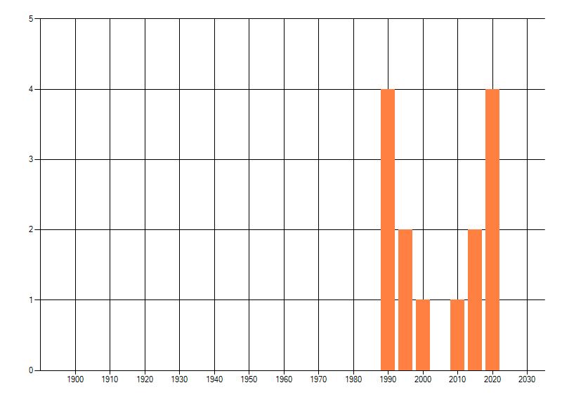 Het aantal atlasblokken (5x5 km) waarin de soort is gemeld binnen een periode van vijf jaar (vanaf 1980) of twintig jaar. Niet gecorrigeerd voor waarnemersinspanning en het aantal doorgegeven waarnemingen kan sterk variëren per periode, dus een trend in verspreiding kan hier niet direct uit worden afgelezen. Het opgegeven jaartal is het eerste jaar van de periode. Bron: gevalideerde waarnemingen uit de NDFF.