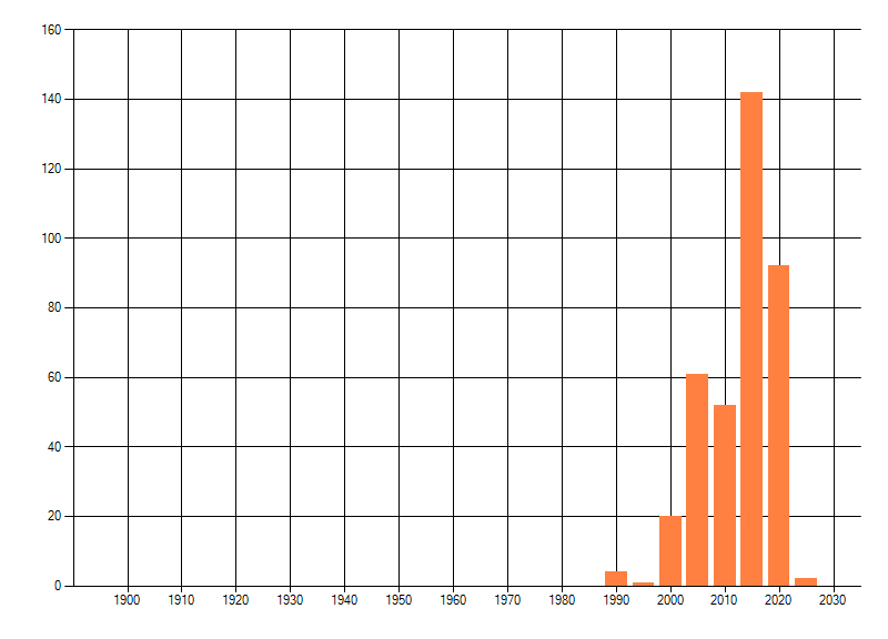 Het aantal atlasblokken (5x5 km) waarin de soort is gemeld binnen een periode van vijf jaar (vanaf 1980) of twintig jaar. Niet gecorrigeerd voor waarnemersinspanning en het aantal doorgegeven waarnemingen kan sterk variëren per periode, dus een trend in verspreiding kan hier niet direct uit worden afgelezen. Het opgegeven jaartal is het eerste jaar van de periode. Bron: gevalideerde waarnemingen uit de NDFF.