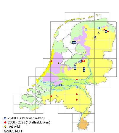 Het aantal atlasblokken (5x5 km) waarin de soort is gemeld binnen een periode van vijf jaar (vanaf 1980) of twintig jaar. Niet gecorrigeerd voor waarnemersinspanning en het aantal doorgegeven waarnemingen kan sterk variëren per periode, dus een trend in verspreiding kan hier niet direct uit worden afgelezen. Het opgegeven jaartal is het eerste jaar van de periode. Bron: gevalideerde waarnemingen uit de NDFF.
