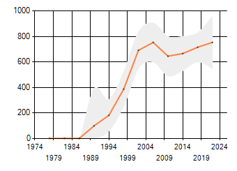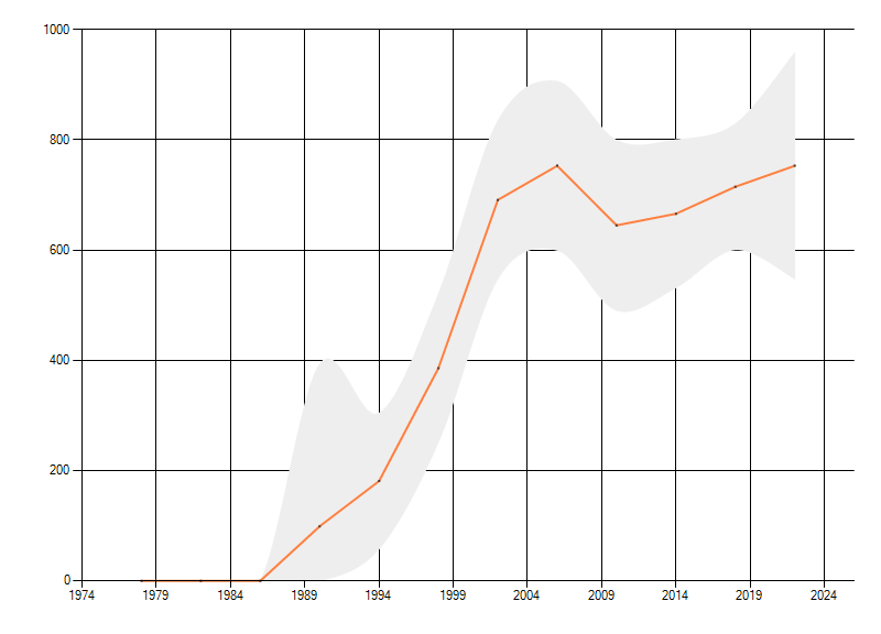 Gemiddelde trend van het aantal kilometerhokken waarin de soort voorkomt, weergegeven als indexcijfer (1975-1978 = 100).