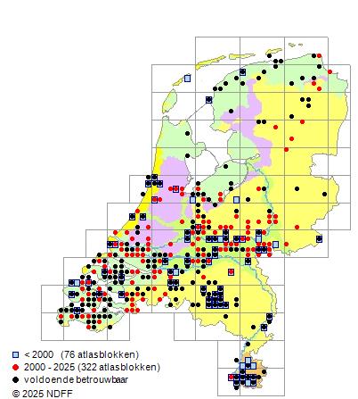 Het voor waarnemingsinspanning gecorrigeerde, of door een expert geschatte aantal atlasblokken (5x5 km) waarin de soort voorkomt per periode van tien jaar. Soms fluctueert het aantal sterk. Hoe vloeiender de lijn, des te betrouwbaarder de grafiek. Bron: Rode Lijst Mossen 2010. © BLWG 2011