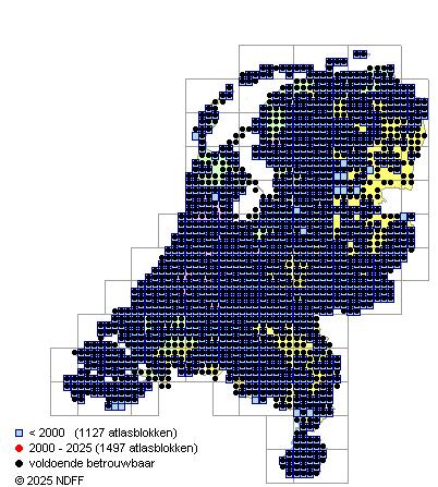 Het aantal atlasblokken (5x5 km) waarin de soort is gemeld binnen een periode van vijf jaar (vanaf 1980) of twintig jaar.