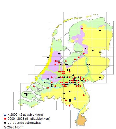 Het aantal atlasblokken (5x5 km) waarin de soort is gemeld binnen een periode van vijf jaar (vanaf 1980) of twintig jaar.