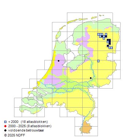 Het aantal atlasblokken (5x5 km) waarin de soort is gemeld binnen een periode van vijf jaar (vanaf 1980) of twintig jaar. Niet gecorrigeerd voor waarnemersinspanning en het aantal doorgegeven waarnemingen kan sterk variëren per periode, dus een trend in verspreiding kan hier niet direct uit worden afgelezen. Het opgegeven jaartal is het eerste jaar van de periode. Bron: gevalideerde waarnemingen uit de NDFF.