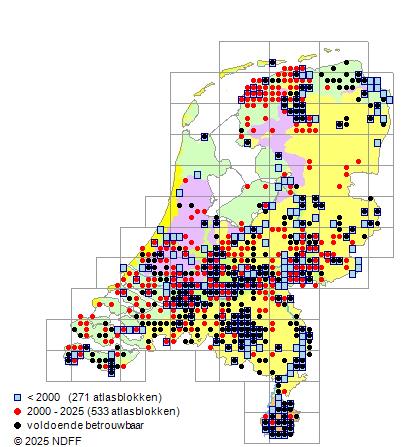 Het voor waarnemingsinspanning gecorrigeerde, of door een expert geschatte aantal atlasblokken (5x5 km) waarin de soort voorkomt per periode van tien jaar. Soms fluctueert het aantal sterk. Hoe vloeiender de lijn, des te betrouwbaarder de grafiek. Bron: Rode Lijst Mossen 2010. © BLWG 2011