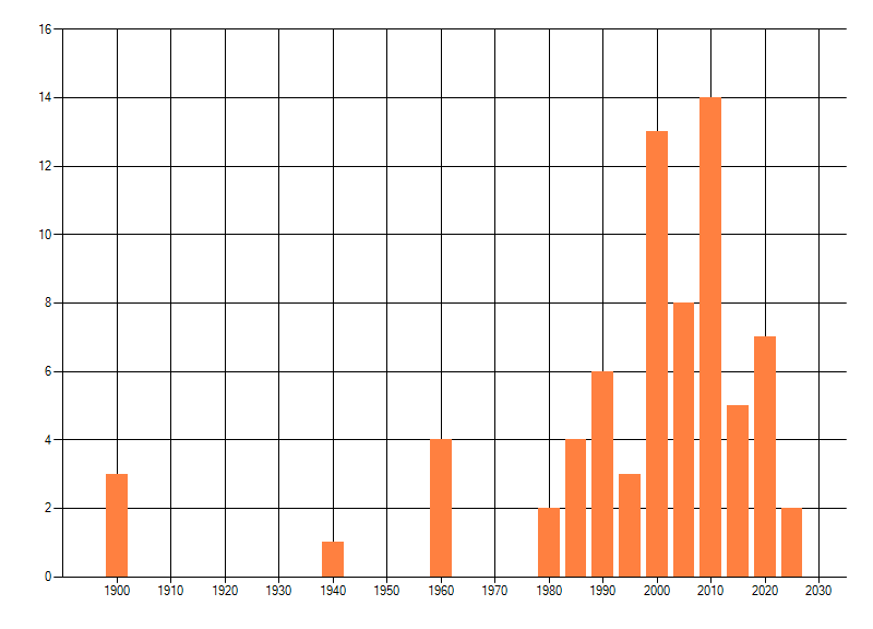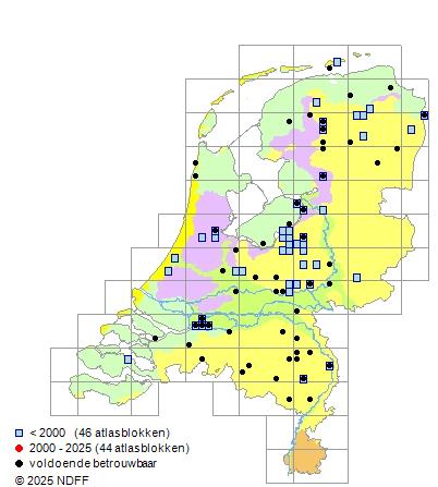Het aantal atlasblokken (5x5 km) waarin de soort is gemeld binnen een periode van vijf jaar (vanaf 1980) of twintig jaar. Niet gecorrigeerd voor waarnemersinspanning en het aantal doorgegeven waarnemingen kan sterk variëren per periode, dus een trend in verspreiding kan hier niet direct uit worden afgelezen. Het opgegeven jaartal is het eerste jaar van de periode. Bron: gevalideerde waarnemingen uit de NDFF.