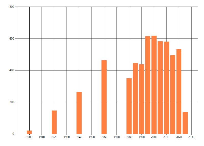 Het aantal atlasblokken (5x5 km) waarin de soort is gemeld binnen een periode van vijf jaar (vanaf 1980) of twintig jaar. Niet gecorrigeerd voor waarnemersinspanning en het aantal doorgegeven waarnemingen kan sterk variëren per periode, dus een trend in verspreiding kan hier niet direct uit worden afgelezen. Het opgegeven jaartal is het eerste jaar van de periode. Bron: gevalideerde waarnemingen uit de NDFF.