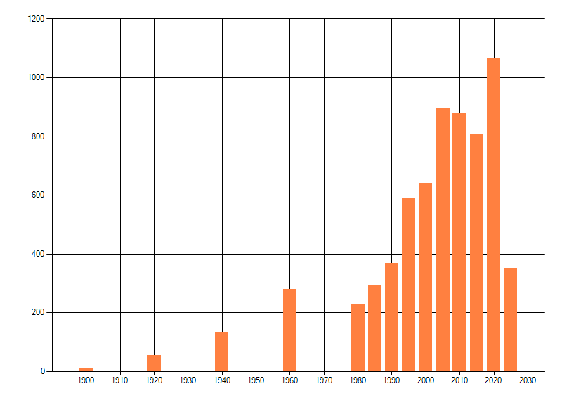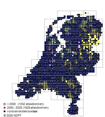 Het aantal atlasblokken (5x5 km) waarin de soort is gemeld binnen een periode van vijf jaar (vanaf 1980) of twintig jaar. Niet gecorrigeerd voor waarnemersinspanning en het aantal doorgegeven waarnemingen kan sterk variƫren per periode, dus een trend in verspreiding kan hier niet direct uit worden afgelezen. Het opgegeven jaartal is het eerste jaar van de periode. Bron: gevalideerde waarnemingen uit de NDFF.
