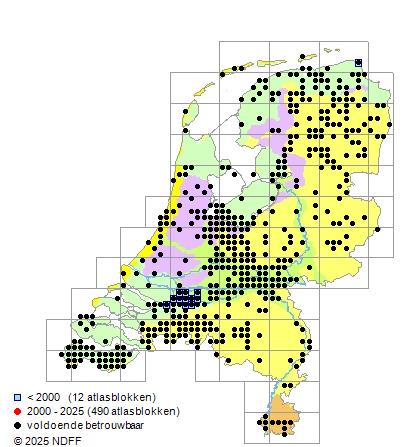 Het aantal atlasblokken (5x5 km) waarin de soort is gemeld binnen een periode van vijf jaar (vanaf 1980) of twintig jaar. Niet gecorrigeerd voor waarnemersinspanning en het aantal doorgegeven waarnemingen kan sterk variëren per periode, dus een trend in verspreiding kan hier niet direct uit worden afgelezen. Het opgegeven jaartal is het eerste jaar van de periode. Bron: gevalideerde waarnemingen uit de NDFF.