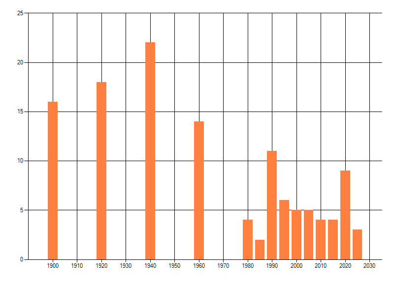 Het aantal atlasblokken (5x5 km) waarin de soort is gemeld binnen een periode van vijf jaar (vanaf 1980) of twintig jaar. Niet gecorrigeerd voor waarnemersinspanning en het aantal doorgegeven waarnemingen kan sterk variëren per periode, dus een trend in verspreiding kan hier niet direct uit worden afgelezen. Het opgegeven jaartal is het eerste jaar van de periode. Bron: gevalideerde waarnemingen uit de NDFF.