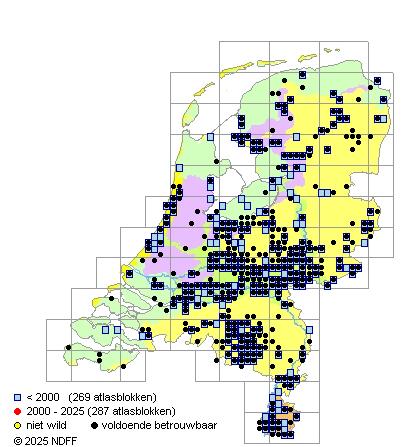 Het voor waarnemingsinspanning gecorrigeerde, of door een expert geschatte aantal atlasblokken (5x5 km) waarin de soort voorkomt per periode van tien jaar. Soms fluctueert het aantal sterk. Hoe vloeiender de lijn, des te betrouwbaarder de grafiek. Bron: Rode Lijst Mossen 2010. © BLWG 2011