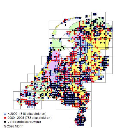 Het voor waarnemingsinspanning gecorrigeerde, of door een expert geschatte aantal atlasblokken (5x5 km) waarin de soort voorkomt per periode van tien jaar. Soms fluctueert het aantal sterk. Hoe vloeiender de lijn, des te betrouwbaarder de grafiek. Bron: Rode Lijst Mossen 2010. © BLWG 2011