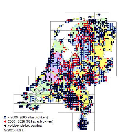 Het voor waarnemingsinspanning gecorrigeerde, of door een expert geschatte aantal atlasblokken (5x5 km) waarin de soort voorkomt per periode van tien jaar. Soms fluctueert het aantal sterk. Hoe vloeiender de lijn, des te betrouwbaarder de grafiek. Bron: Rode Lijst Mossen 2010. © BLWG 2011