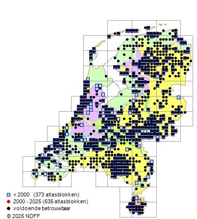Het aantal atlasblokken (5x5 km) waarin de soort is gemeld binnen een periode van vijf jaar (vanaf 1980) of twintig jaar. Niet gecorrigeerd voor waarnemersinspanning en het aantal doorgegeven waarnemingen kan sterk variëren per periode, dus een trend in verspreiding kan hier niet direct uit worden afgelezen. Het opgegeven jaartal is het eerste jaar van de periode. Bron: gevalideerde waarnemingen uit de NDFF.