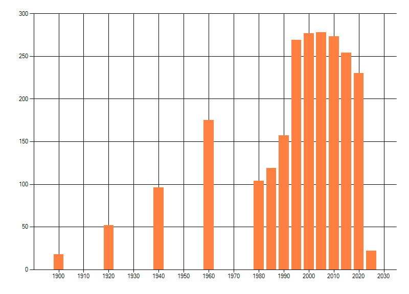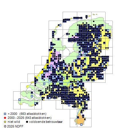 Het aantal atlasblokken (5x5 km) waarin de soort is gemeld binnen een periode van vijf jaar (vanaf 1980) of twintig jaar. Niet gecorrigeerd voor waarnemersinspanning en het aantal doorgegeven waarnemingen kan sterk variëren per periode, dus een trend in verspreiding kan hier niet direct uit worden afgelezen. Het opgegeven jaartal is het eerste jaar van de periode. Bron: gevalideerde waarnemingen uit de NDFF.