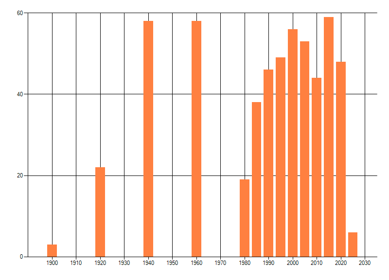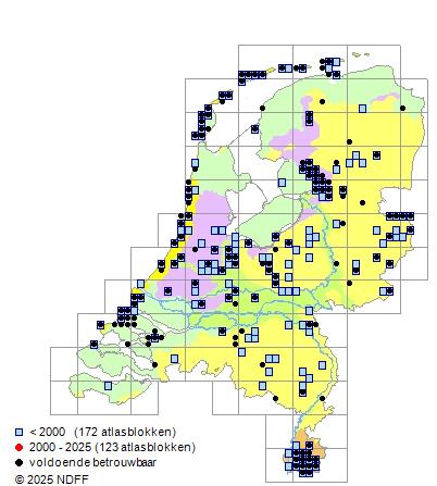 Het aantal atlasblokken (5x5 km) waarin de soort is gemeld binnen een periode van vijf jaar (vanaf 1980) of twintig jaar. Niet gecorrigeerd voor waarnemersinspanning en het aantal doorgegeven waarnemingen kan sterk variëren per periode, dus een trend in verspreiding kan hier niet direct uit worden afgelezen. Het opgegeven jaartal is het eerste jaar van de periode. Bron: gevalideerde waarnemingen uit de NDFF.