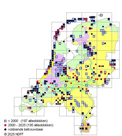 Het voor waarnemingsinspanning gecorrigeerde, of door een expert geschatte aantal atlasblokken (5x5 km) waarin de soort voorkomt per periode van tien jaar. Soms fluctueert het aantal sterk. Hoe vloeiender de lijn, des te betrouwbaarder de grafiek. Bron: Rode Lijst Mossen 2010. © BLWG 2011
