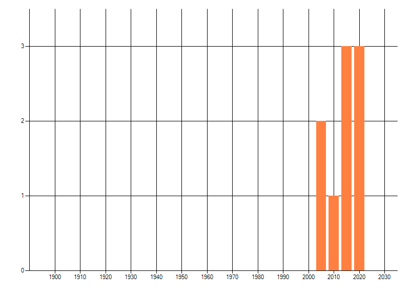 Het aantal atlasblokken (5x5 km) waarin de soort is gemeld binnen een periode van vijf jaar (vanaf 1980) of twintig jaar. Niet gecorrigeerd voor waarnemersinspanning en het aantal doorgegeven waarnemingen kan sterk variëren per periode, dus een trend in verspreiding kan hier niet direct uit worden afgelezen. Het opgegeven jaartal is het eerste jaar van de periode. Bron: gevalideerde waarnemingen uit de NDFF.