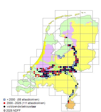 Het voor waarnemingsinspanning gecorrigeerde, of door een expert geschatte aantal atlasblokken (5x5 km) waarin de soort voorkomt per periode van tien jaar. Soms fluctueert het aantal sterk. Hoe vloeiender de lijn, des te betrouwbaarder de grafiek. Bron: Rode Lijst Mossen 2010. © BLWG 2011