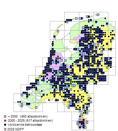 Het aantal atlasblokken (5x5 km) waarin de soort is gemeld binnen een periode van vijf jaar (vanaf 1980) of twintig jaar. Niet gecorrigeerd voor waarnemersinspanning en het aantal doorgegeven waarnemingen kan sterk variƫren per periode, dus een trend in verspreiding kan hier niet direct uit worden afgelezen. Het opgegeven jaartal is het eerste jaar van de periode. Bron: gevalideerde waarnemingen uit de NDFF.