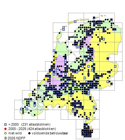 Het aantal atlasblokken (5x5 km) waarin de soort is gemeld binnen een periode van vijf jaar (vanaf 1980) of twintig jaar. Niet gecorrigeerd voor waarnemersinspanning en het aantal doorgegeven waarnemingen kan sterk variëren per periode, dus een trend in verspreiding kan hier niet direct uit worden afgelezen. Het opgegeven jaartal is het eerste jaar van de periode. Bron: gevalideerde waarnemingen uit de NDFF.