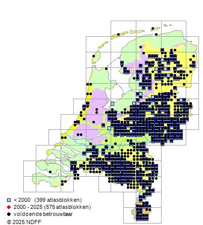 Het voor waarnemingsinspanning gecorrigeerde, of door een expert geschatte aantal atlasblokken (5x5 km) waarin de soort voorkomt per periode van tien jaar. Soms fluctueert het aantal sterk. Hoe vloeiender de lijn, des te betrouwbaarder de grafiek. Bron: Rode Lijst Mossen 2010. © BLWG 2011