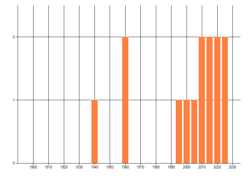 Het aantal atlasblokken (5x5 km) waarin de soort is gemeld binnen een periode van vijf jaar (vanaf 1980) of twintig jaar. Niet gecorrigeerd voor waarnemersinspanning en het aantal doorgegeven waarnemingen kan sterk variëren per periode, dus een trend in verspreiding kan hier niet direct uit worden afgelezen. Het opgegeven jaartal is het eerste jaar van de periode. Bron: gevalideerde waarnemingen uit de NDFF.