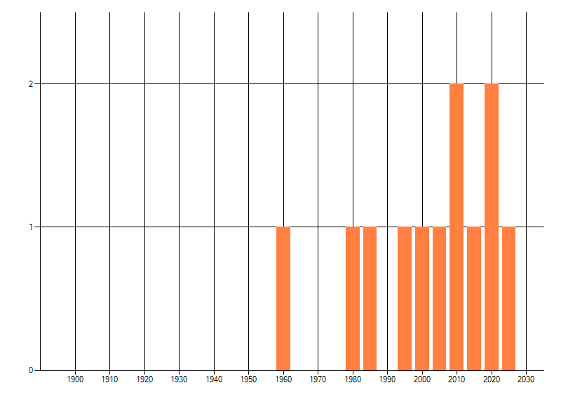 Het aantal atlasblokken (5x5 km) waarin de soort is gemeld binnen een periode van vijf jaar (vanaf 1980) of twintig jaar. Niet gecorrigeerd voor waarnemersinspanning en het aantal doorgegeven waarnemingen kan sterk variëren per periode, dus een trend in verspreiding kan hier niet direct uit worden afgelezen. Het opgegeven jaartal is het eerste jaar van de periode. Bron: gevalideerde waarnemingen uit de NDFF.