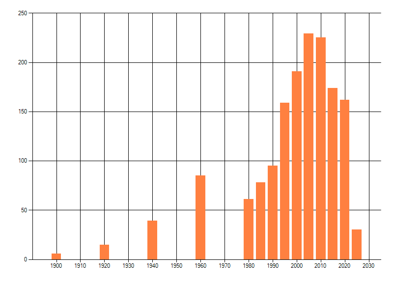 Het aantal atlasblokken (5x5 km) waarin de soort is gemeld binnen een periode van vijf jaar (vanaf 1980) of twintig jaar. Niet gecorrigeerd voor waarnemersinspanning en het aantal doorgegeven waarnemingen kan sterk variëren per periode, dus een trend in verspreiding kan hier niet direct uit worden afgelezen. Het opgegeven jaartal is het eerste jaar van de periode. Bron: gevalideerde waarnemingen uit de NDFF.