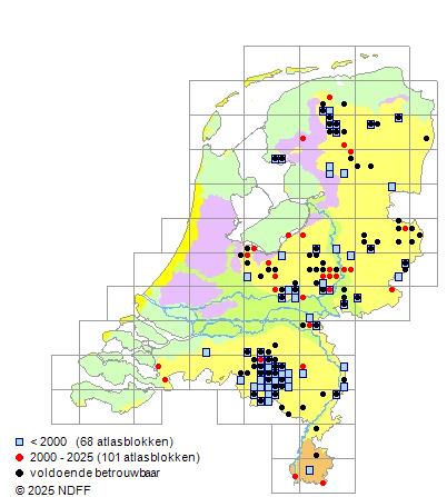 Het voor waarnemingsinspanning gecorrigeerde, of door een expert geschatte aantal atlasblokken (5x5 km) waarin de soort voorkomt per periode van tien jaar. Soms fluctueert het aantal sterk. Hoe vloeiender de lijn, des te betrouwbaarder de grafiek. Bron: Rode Lijst Mossen 2010. © BLWG 2011