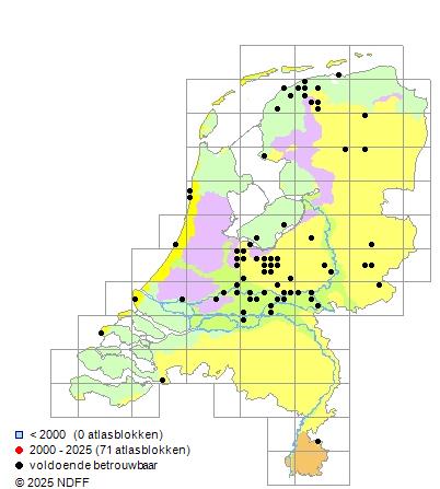 Het aantal atlasblokken (5x5 km) waarin de soort is gemeld binnen een periode van vijf jaar (vanaf 1980) of twintig jaar.