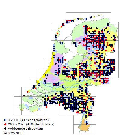 Het voor waarnemingsinspanning gecorrigeerde, of door een expert geschatte aantal atlasblokken (5x5 km) waarin de soort voorkomt per periode van tien jaar. Soms fluctueert het aantal sterk. Hoe vloeiender de lijn, des te betrouwbaarder de grafiek. Bron: Rode Lijst Mossen 2010. © BLWG 2011