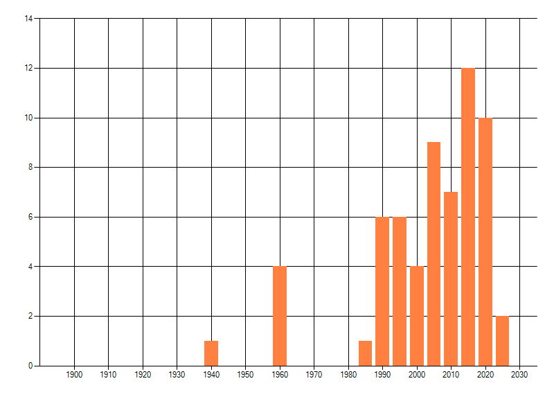 Het aantal atlasblokken (5x5 km) waarin de soort is gemeld binnen een periode van vijf jaar (vanaf 1980) of twintig jaar. Niet gecorrigeerd voor waarnemersinspanning en het aantal doorgegeven waarnemingen kan sterk variëren per periode, dus een trend in verspreiding kan hier niet direct uit worden afgelezen. Het opgegeven jaartal is het eerste jaar van de periode. Bron: gevalideerde waarnemingen uit de NDFF.
