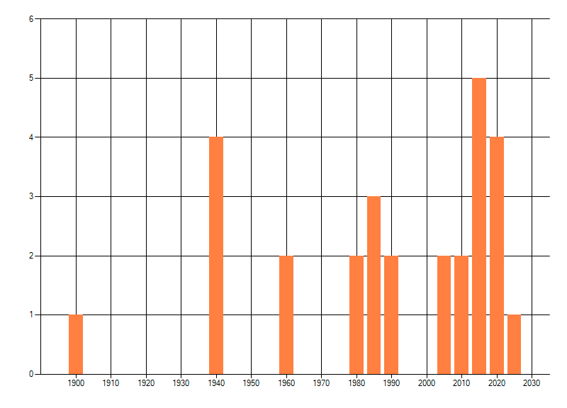 Het aantal atlasblokken (5x5 km) waarin de soort is gemeld binnen een periode van vijf jaar (vanaf 1980) of twintig jaar. Niet gecorrigeerd voor waarnemersinspanning en het aantal doorgegeven waarnemingen kan sterk variëren per periode, dus een trend in verspreiding kan hier niet direct uit worden afgelezen. Het opgegeven jaartal is het eerste jaar van de periode. Bron: gevalideerde waarnemingen uit de NDFF.