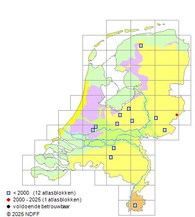 Het voor waarnemingsinspanning gecorrigeerde, of door een expert geschatte aantal atlasblokken (5x5 km) waarin de soort voorkomt per periode van tien jaar. Soms fluctueert het aantal sterk. Hoe vloeiender de lijn, des te betrouwbaarder de grafiek. Bron: Rode Lijst Mossen 2010. © BLWG 2011