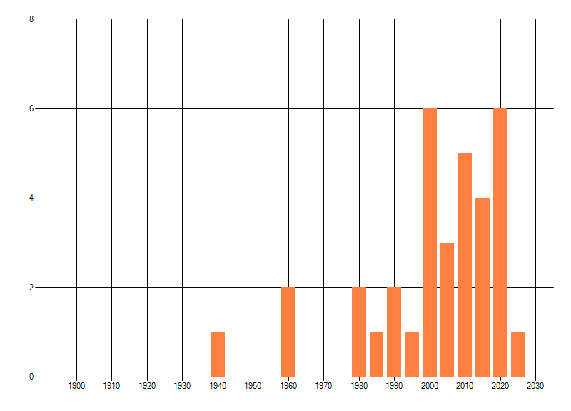 Het aantal atlasblokken (5x5 km) waarin de soort is gemeld binnen een periode van vijf jaar (vanaf 1980) of twintig jaar. Niet gecorrigeerd voor waarnemersinspanning en het aantal doorgegeven waarnemingen kan sterk variëren per periode, dus een trend in verspreiding kan hier niet direct uit worden afgelezen. Het opgegeven jaartal is het eerste jaar van de periode. Bron: gevalideerde waarnemingen uit de NDFF.