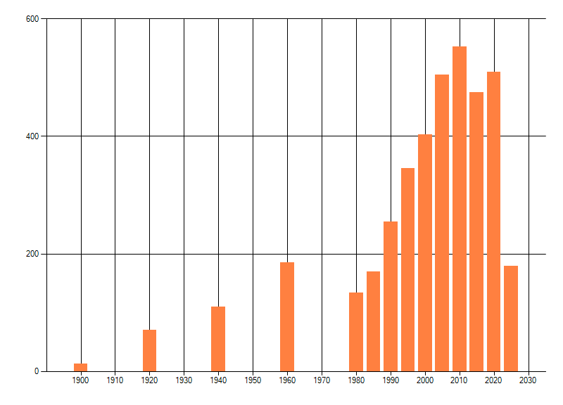 Het aantal atlasblokken (5x5 km) waarin de soort is gemeld binnen een periode van vijf jaar (vanaf 1980) of twintig jaar. Niet gecorrigeerd voor waarnemersinspanning en het aantal doorgegeven waarnemingen kan sterk variëren per periode, dus een trend in verspreiding kan hier niet direct uit worden afgelezen. Het opgegeven jaartal is het eerste jaar van de periode. Bron: gevalideerde waarnemingen uit de NDFF.