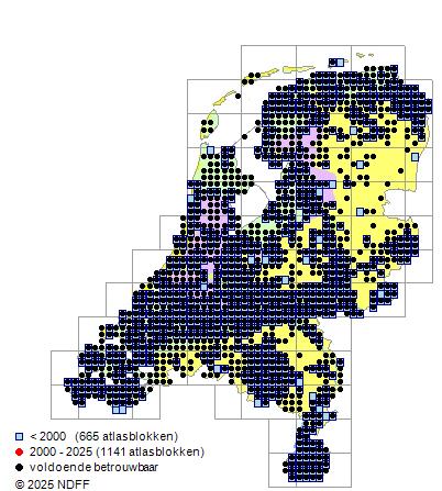 Het voor waarnemingsinspanning gecorrigeerde, of door een expert geschatte aantal atlasblokken (5x5 km) waarin de soort voorkomt per periode van tien jaar. Soms fluctueert het aantal sterk. Hoe vloeiender de lijn, des te betrouwbaarder de grafiek. Bron: Rode Lijst Mossen 2010. © BLWG 2011