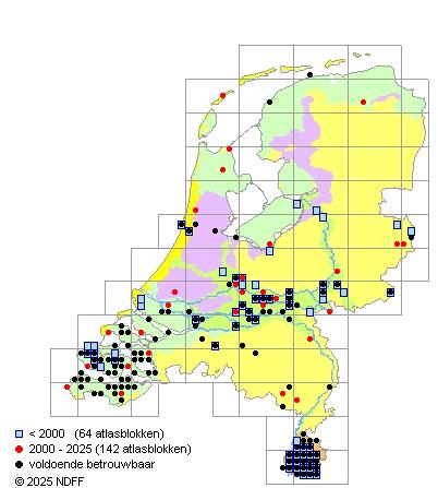 Het voor waarnemingsinspanning gecorrigeerde, of door een expert geschatte aantal atlasblokken (5x5 km) waarin de soort voorkomt per periode van tien jaar. Soms fluctueert het aantal sterk. Hoe vloeiender de lijn, des te betrouwbaarder de grafiek. Bron: Rode Lijst Mossen 2010. © BLWG 2011