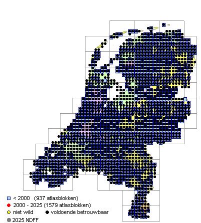 Het aantal atlasblokken (5x5 km) waarin de soort is gemeld binnen een periode van vijf jaar (vanaf 1980) of twintig jaar.