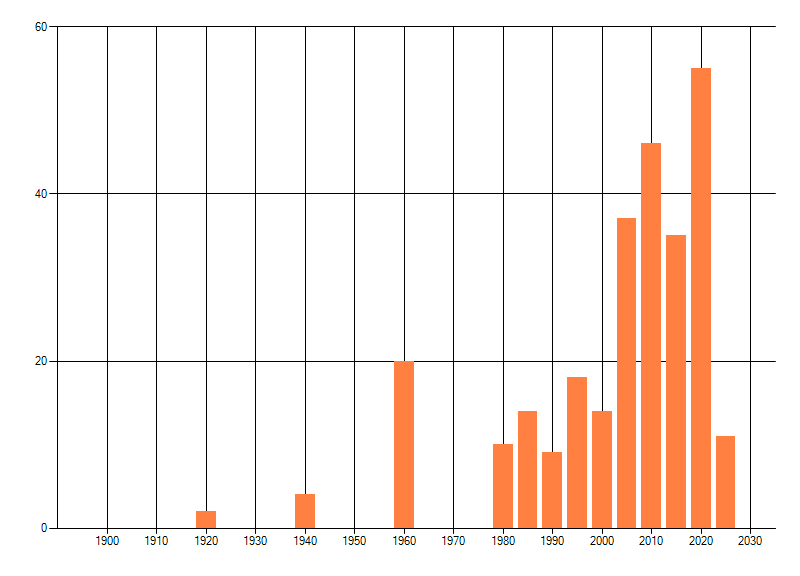 Het aantal atlasblokken (5x5 km) waarin de soort is gemeld binnen een periode van vijf jaar (vanaf 1980) of twintig jaar. Niet gecorrigeerd voor waarnemersinspanning en het aantal doorgegeven waarnemingen kan sterk variëren per periode, dus een trend in verspreiding kan hier niet direct uit worden afgelezen. Het opgegeven jaartal is het eerste jaar van de periode. Bron: gevalideerde waarnemingen uit de NDFF.