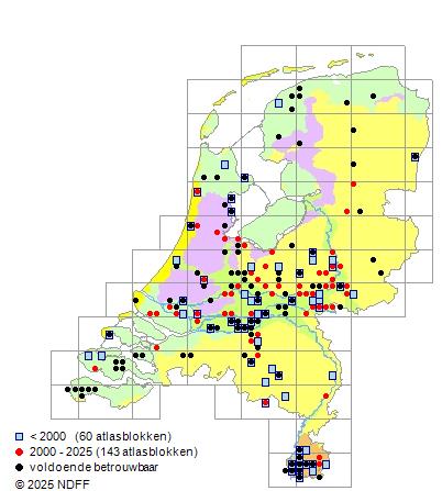 Het voor waarnemingsinspanning gecorrigeerde, of door een expert geschatte aantal atlasblokken (5x5 km) waarin de soort voorkomt per periode van tien jaar. Soms fluctueert het aantal sterk. Hoe vloeiender de lijn, des te betrouwbaarder de grafiek. Bron: Rode Lijst Mossen 2010. © BLWG 2011